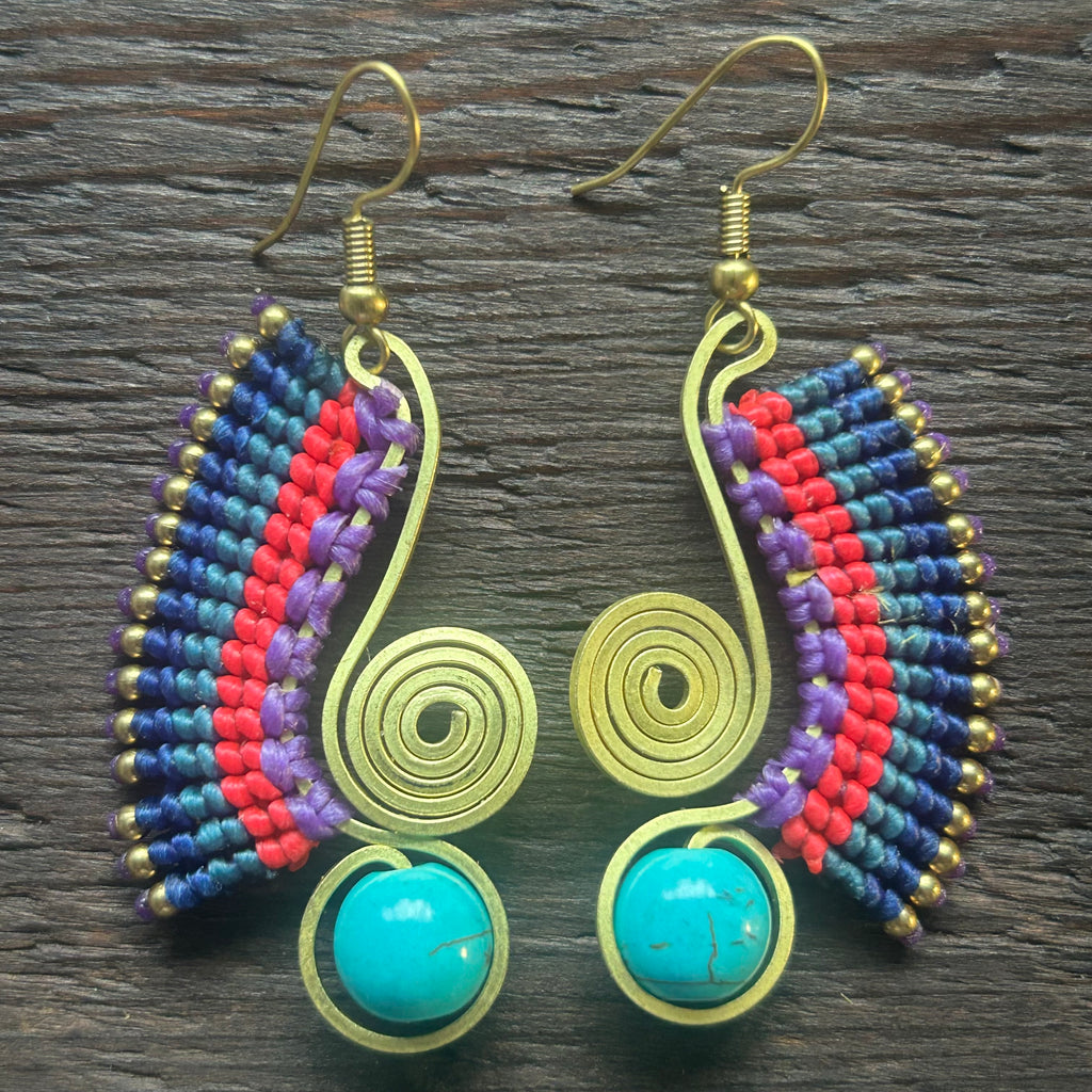 Part of our 'Tri-Beca' collection - Handmade Earring made of Macrame, Brass and Waxed Cotton . These are woven into a beautiful brass plated wing design & each pair features a beautiful complimentary bead